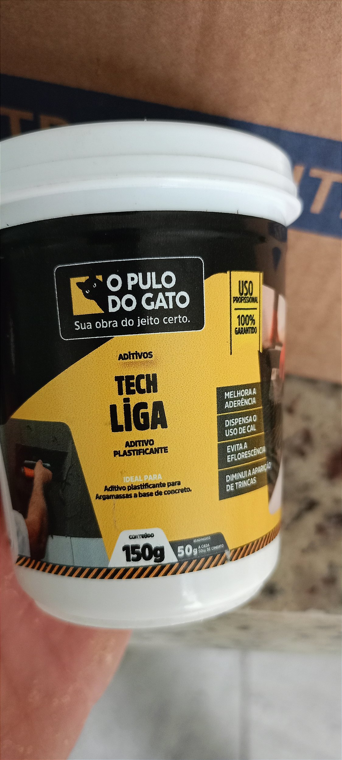Tec liga. É um aditivo plastificante que otimiza a trabalhabilidade da massa.